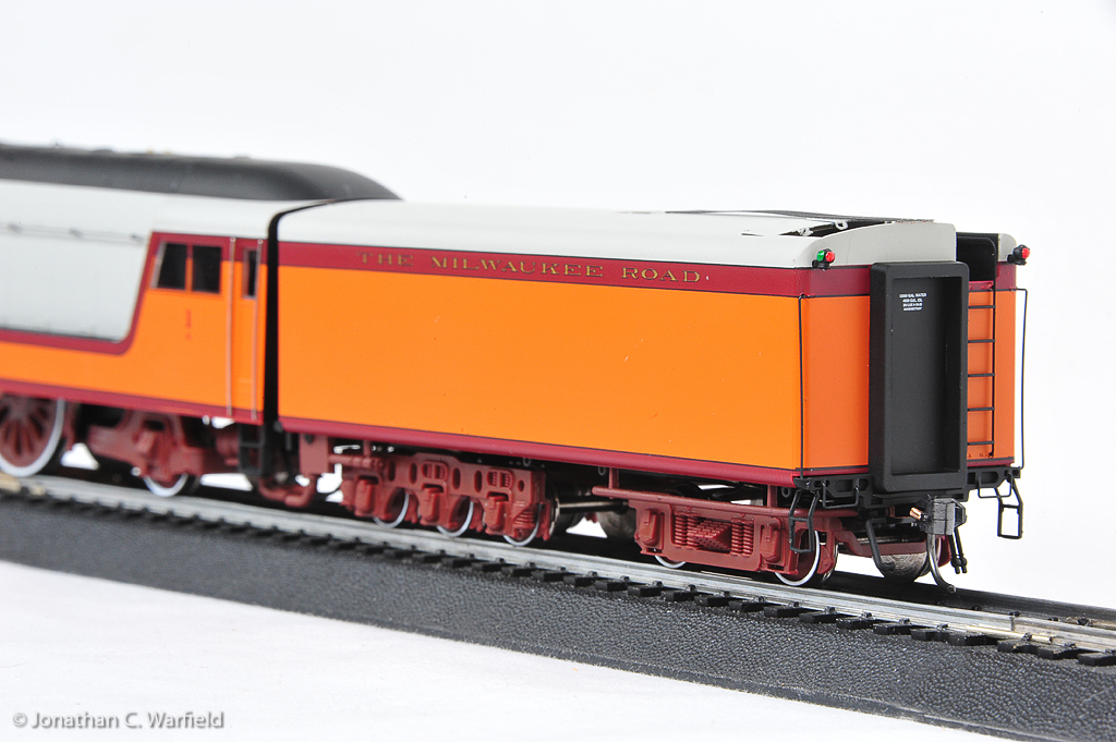 Looking pretty sleek! This particular model represents the 1935 Milwaukee Road Hiawatha that ran between Chicago and the Twin Cities. The streamlined bodywork, designed by industrial designer, Otto Kuhler, covered a Class A 4-4-2 Atlantic steam locomotive. Following the inauguration of the Hiawatha in 1935, the train became very popular with travelers. The cars pulled by the locomotive included the first Tap-Cafe car, coaches, Parlor and the iconic “Beaver Tail” Observation car bringing up the rear. This was a fast steamer! It was oil fired to reduce service times, and could pull its consist in speeds in excess of 100mph.