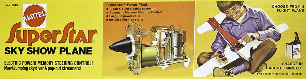 As a kid I loved airplanes. I’d spend hours tossing around a balsa wood glider from Comet that could be purchased at the impulse rack near the cash register at the local department store. After seeing a commercial about the SuperStar, I knew I had to have one. The Superstar was an electric free-flight airplane with some truly unique features. It was powered by on-board rechargeable ni-cad cells that were recharged by connecting a 6v lantern battery. This gave the plane a couple of minutes of flight. But that’s not all, the plane could be flown in a designated pattern by choosing one of a set of four flight “disks” and, could drop a parachutist and release a streamer while in flight as part of its flight program.